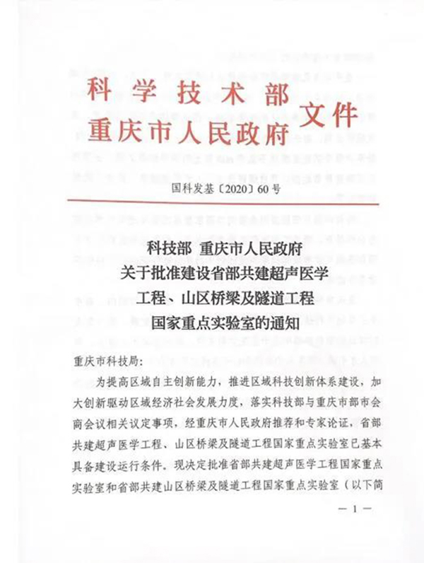 近日,科學技術部、重慶市人民政府聯合下發了《關于批準建設省部共建超聲醫學工程、山區橋梁及隧道工程國家重點實驗室的通知》,批準依托重慶醫科大學建設省部共建超聲醫學工程國家重點實驗室,依托重慶交通大學建設省部共建山區橋梁及隧道工程國家重點實驗室。這標志著重醫在超聲醫學基礎和應用研究領域正式邁入了“國家隊”,實現了重慶市在省部共建國家重點實驗室序列零的突破。