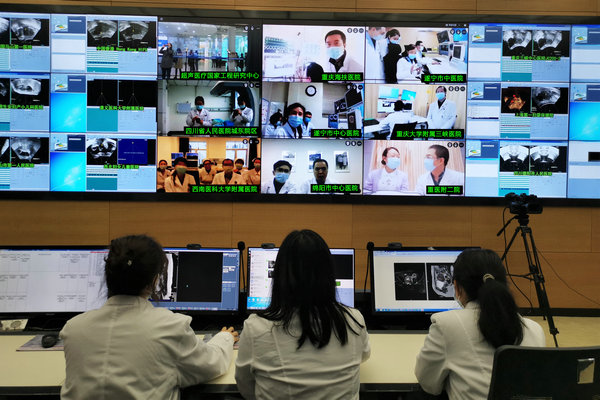 在超聲醫療國家工程研究中心的聚焦超聲消融手術全球協同服務中心,調研人員與川渝兩地使用該技術的四川省人民醫院城東院區、西南醫科大學附屬醫院、遂寧市中心醫院、遂寧市中醫院、綿陽市中心醫院、重慶大學附屬三峽醫院、重醫附二院、重慶海扶醫院在線交流正在實時開展的聚焦超聲消融手術情況。