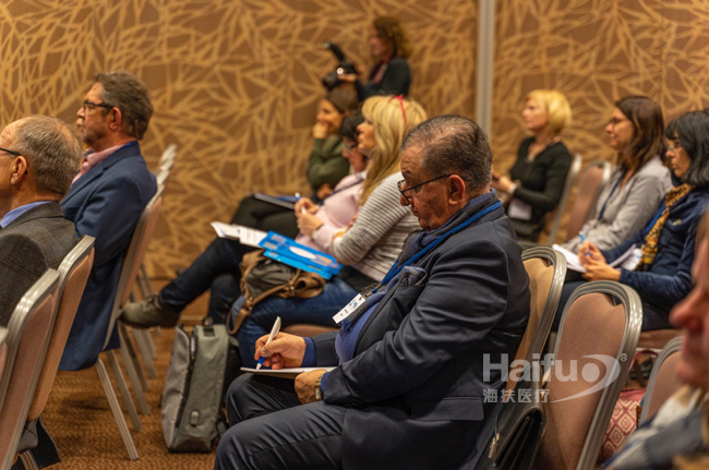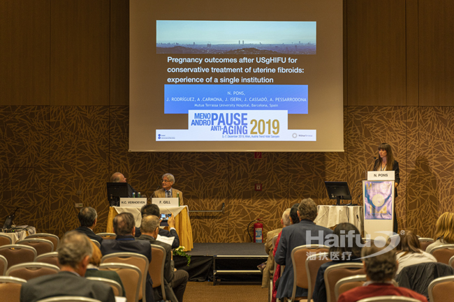來自西班牙HMT醫院 HIFU中心的Pons醫生分享了HIFU治療后,患者自然懷孕的回顧性研究結果以及長達8年的術后隨訪結果,展示了重慶海扶醫療的海扶刀治療的長期療效(肌瘤生長的有效控制、癥狀的持續緩解)。在問答環節,醫生聽眾對重慶海扶醫療的設備及技術非常感興趣,提問積極踴躍。