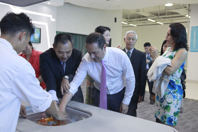 路易斯·蒙薩爾韋大使一行觀摩了聚焦超聲外科模擬治療,并親身感受了超聲波穿透手掌將有機玻璃片“消融”,自己的手掌卻毫發無損的“神奇”治療,對HIFU技術贊嘆不已。