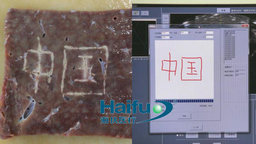 現場視頻資料展示了海扶刀®治療時能夠準確定位,并精準、一次性滅活體內腫瘤,當大家看到視頻里海扶刀®在牛肝里“寫”出中國(顯示為中國的組織即已壞死)兩個字時,都驚嘆不已。特區行政長官林鄭月娥稱贊:這是一項尖端技術。