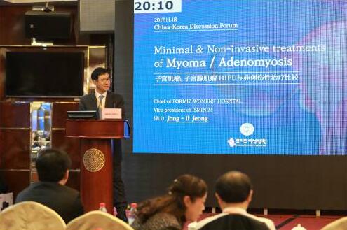 韓國FORMIZ女性醫(yī)院鄭鍾逸院長介紹了韓國盆腔超聲檢查 出的子宮肌瘤及子宮腺肌病的診斷率(子宮肌瘤20%,子宮腺肌病12%,子宮肌瘤合并子宮腺肌病3.1%)。指出癥狀有無與患者的治療相關(guān),應(yīng)根據(jù)其進(jìn)行個性化治療方法的規(guī)劃。然后對最小侵入性治療子宮腫瘤消融手術(shù)、非侵入性(非創(chuàng)傷性)治療HIFU、增進(jìn)HIFU效果的并行治療進(jìn)行了詳細(xì)的闡釋,讓在場嘉賓對韓國HIFU的應(yīng)用及開展情況有了更深入的了解。