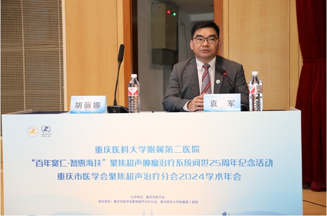 袁軍書記致辭,百年寬仁、智惠海扶,聚焦超聲技術于 1988 年發源于重醫附二院,在其發展的幾十年歷程中,每一個重大節點重醫附二院都留下了身影。從過去到現在,我們始終致力于產學研一體化推進,積極探索醫工融合之路,不斷激發新質生產力。聚焦超聲技術作為中國的原創技術,有著廣闊的發展前景。我們有信心將其用好,使其造福更多的患者,為推動醫療事業的發展,為更多患者帶來福祉而努力奮斗!